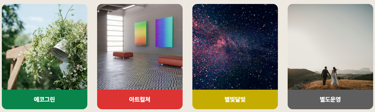 공공예식장은 아래 4개 테마별로 구성되어 있어서 테마별로도 살펴보실 수 있습니다.