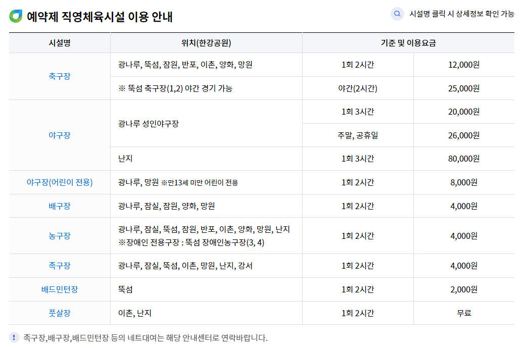 한강공원 체육시설 종류 및 이용방법 종합안내