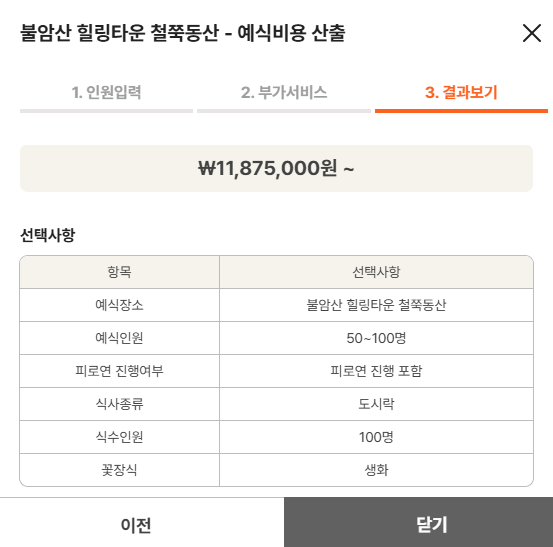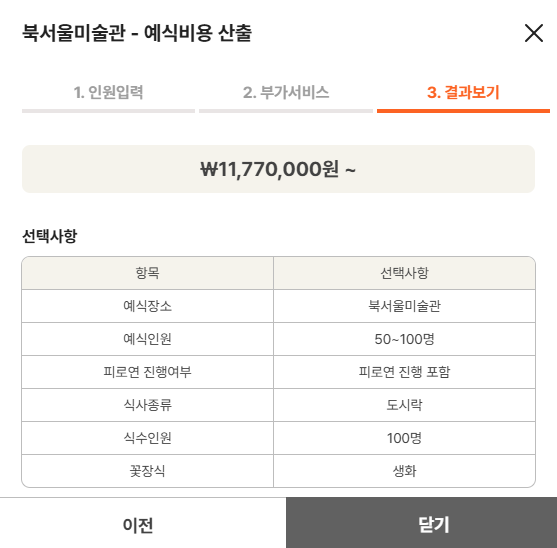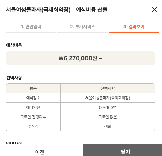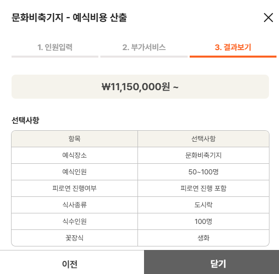 1. 인원수 선택 2. 부가서비스선택(피로연여부,식사종류,식수인원,꽃장식(조화or생화) 3.예식비용산출