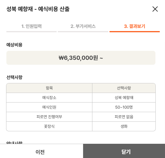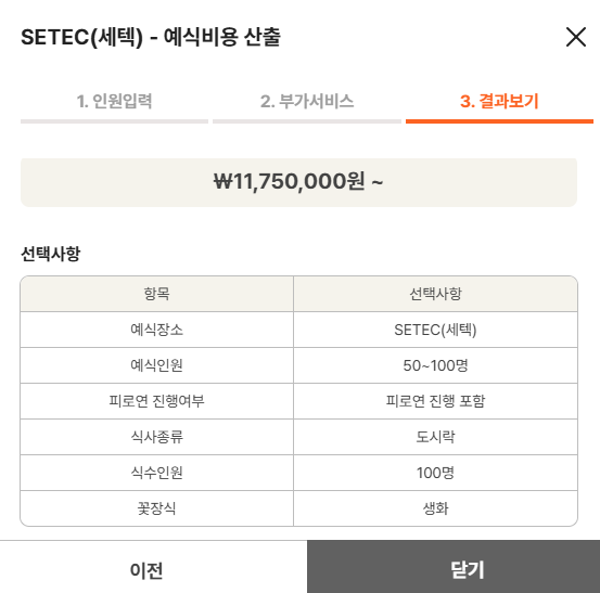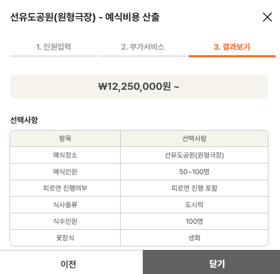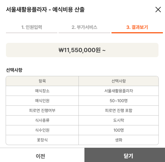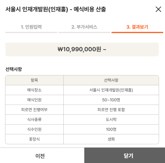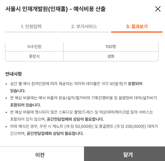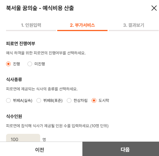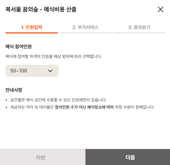 1. 인원수 선택 2. 부가서비스선택(피로연여부,식사종류,식수인원,꽃장식(조화or생화) 3.예식비용산출