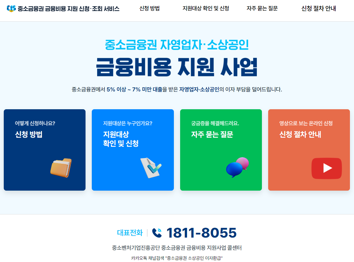 중소금융권 금융비용 지원 신청·조회 서비스 중소금융권에서 5% 이상 ~ 7% 미만 대출을 받은 자영업자·소상공인의 이자 부담을 덜어드립니다.