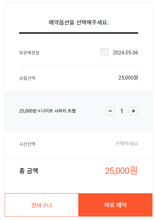 - 홈페이지에서스마트 예약하기 선택한 후 나이트 사파리 트램 예약 페이지로 이동합니다.