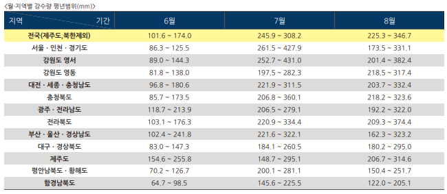 7월 월강수량 : 평년 (245.9~308.2mm)과 비슷하거나 많을 확률이 40%입니다.