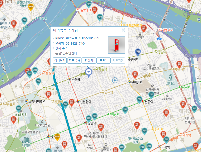 주소이동에서 강남구 선택 -> 장소이동에서 도곡동 선택하셔도 의약품 수거함 위치를 보실 수 있습니다.