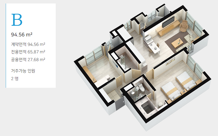 B타입 28.6평형(방 2, 거실 1, 화장실 2, 드레스룸 1)