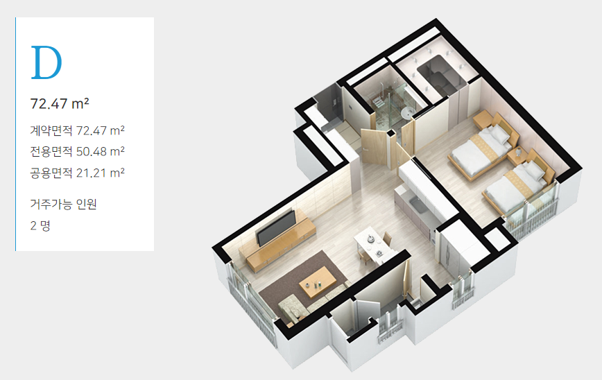 D타입 22평형 ( 방 1, 거실 1, 화장실 1, 드레스룸 1)