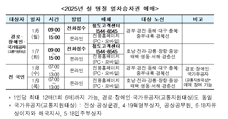 설날 승차권 전체 예매일정 : 1월 6~9일