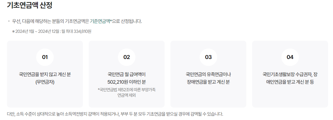 다음에 해당하시는 분들은 기준연금액 월 최대 334,810으로 산정됩니다.
