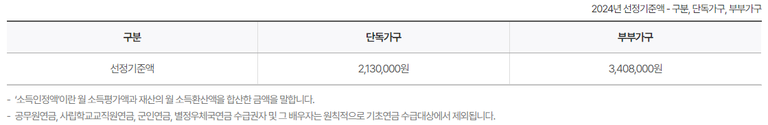 1. 2024년 기초연금 선정기준액 : 단독가구 월 213만원 / 부부가구 월 340.8만원